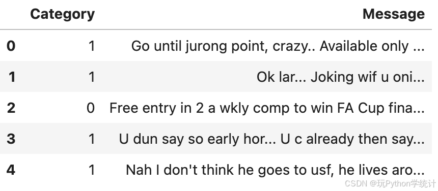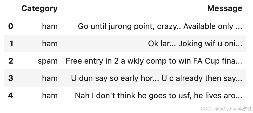 df1 = pd.read_csv('spamham.csv') df = df1.where(pd.notnull(df1)) df.head() # 查看数据前5行