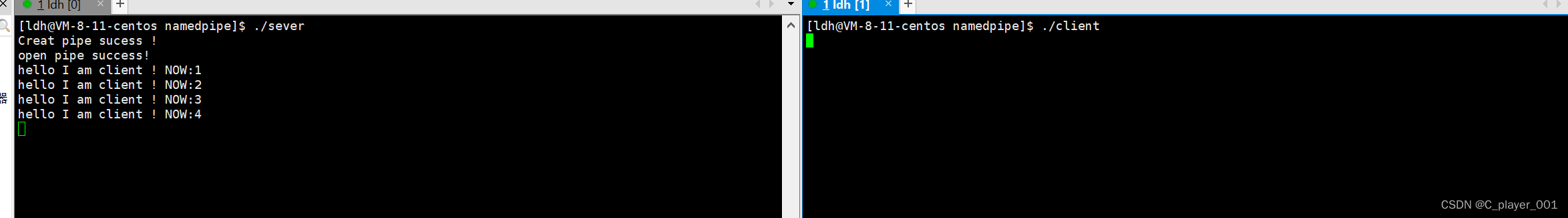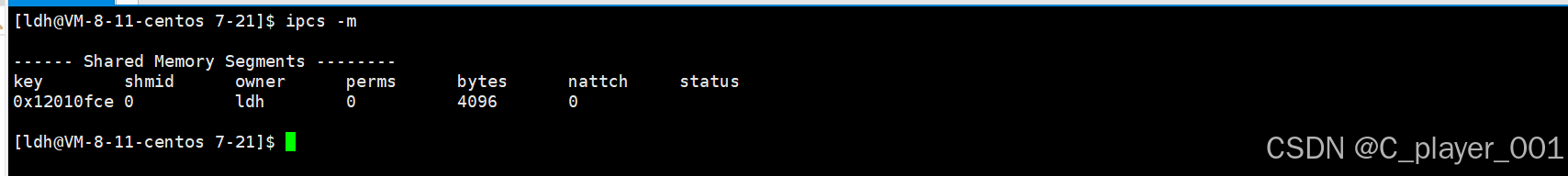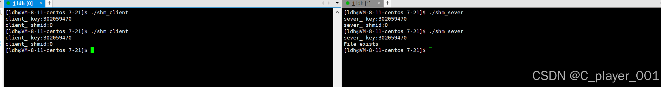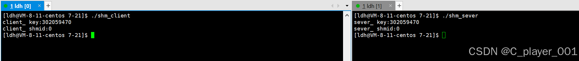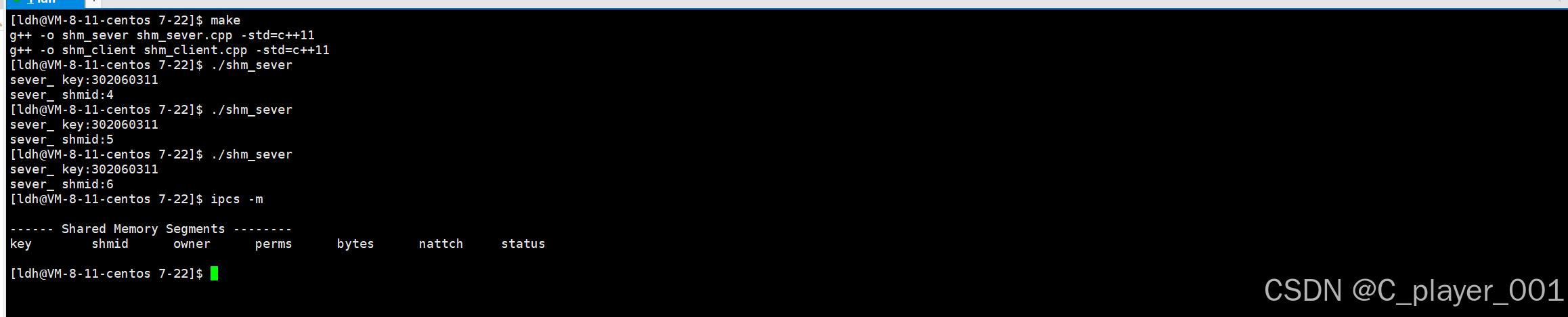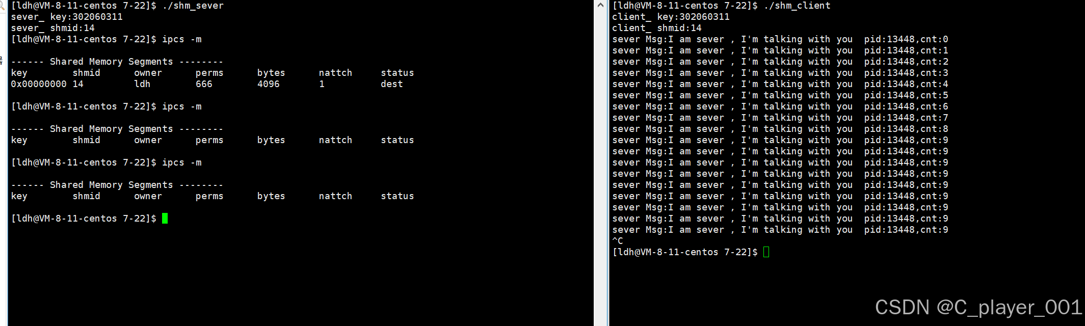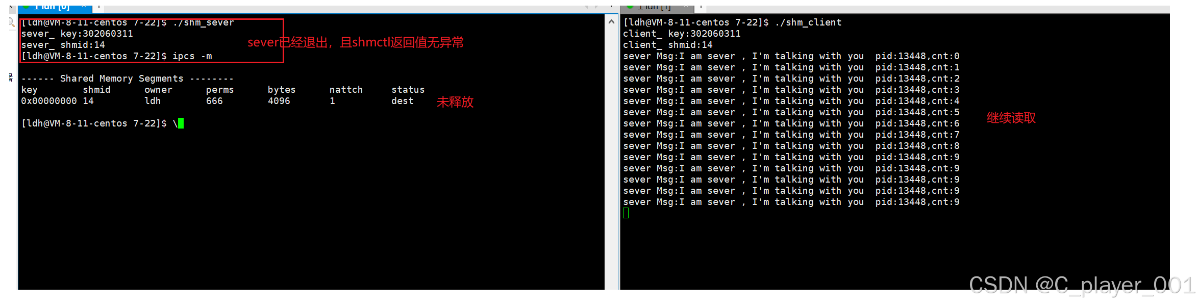 而第二个问题也很简单,虽然我们的sever进程确实调用了 shmctl 进行释放共享内存,他的返回值也确实是 0 ,但是由于这块共享内存还有进程client正在使用(还被进程所挂接),这时候操作系统并不会立马释放共享内存,而是在挂接他的进程数为0时再通知操作系统进行释放,我们可以看一下当sever退出,client还在继续读取共享内存数据时,我们的共享内存资源到底有没有被释放