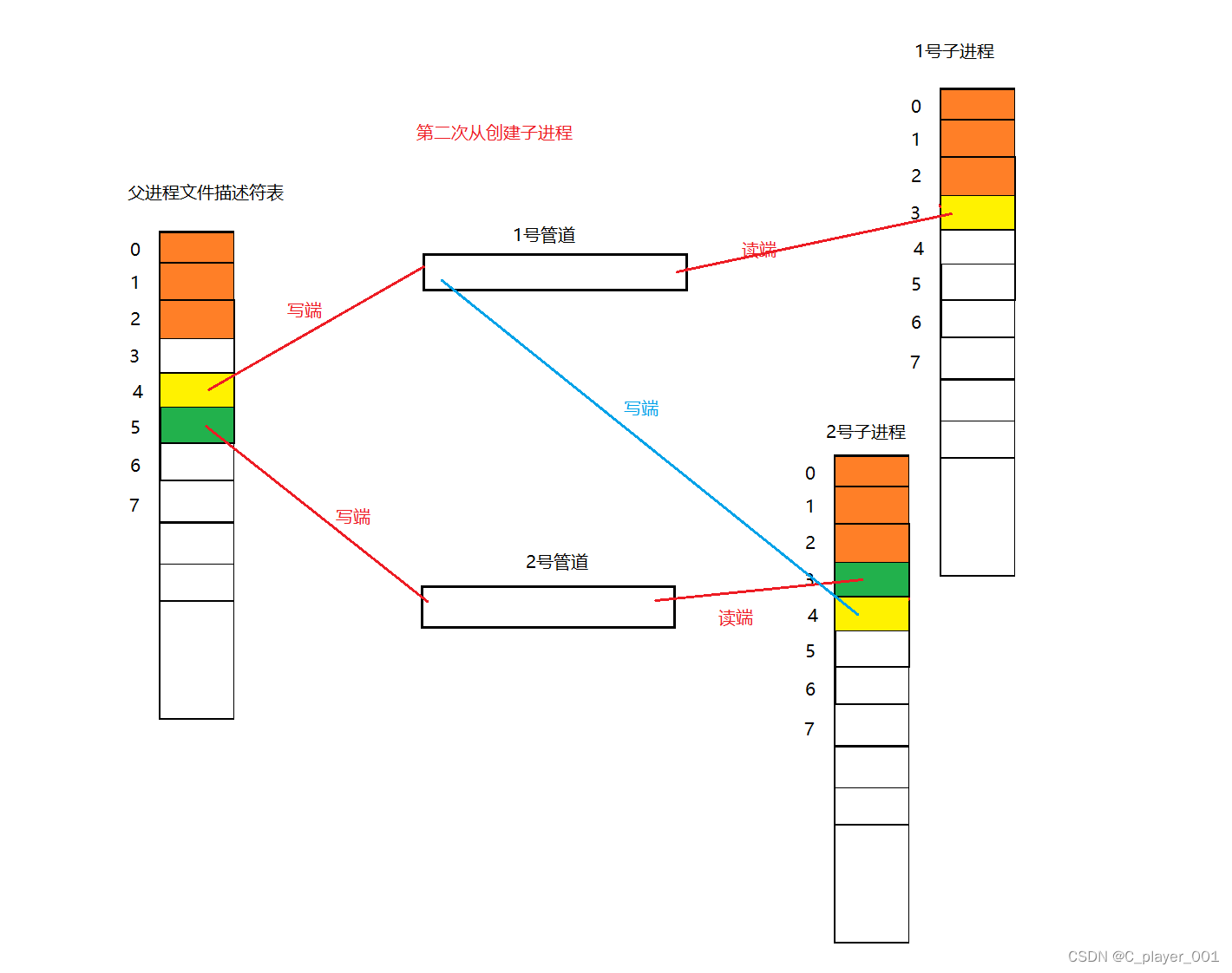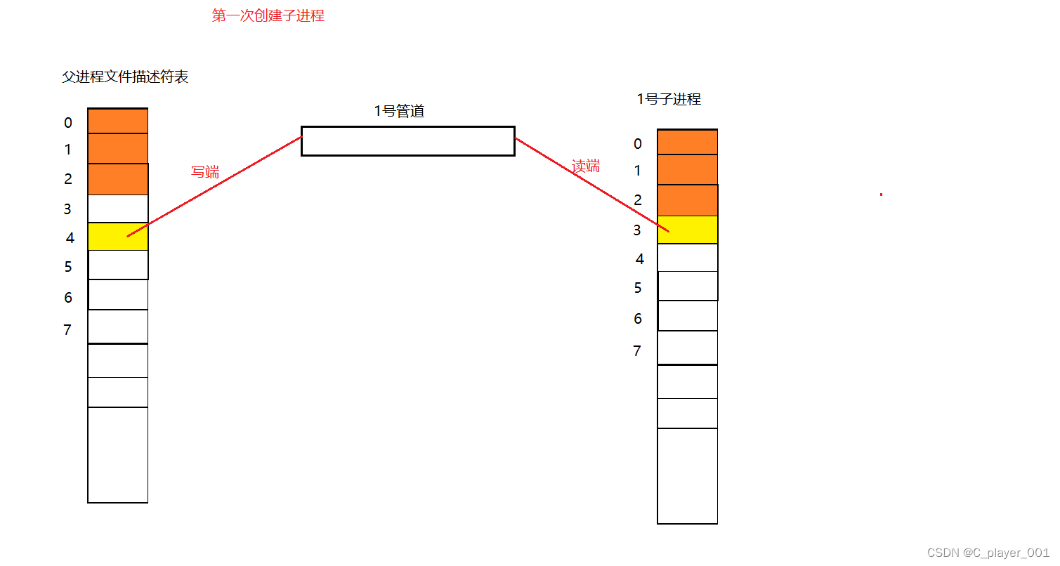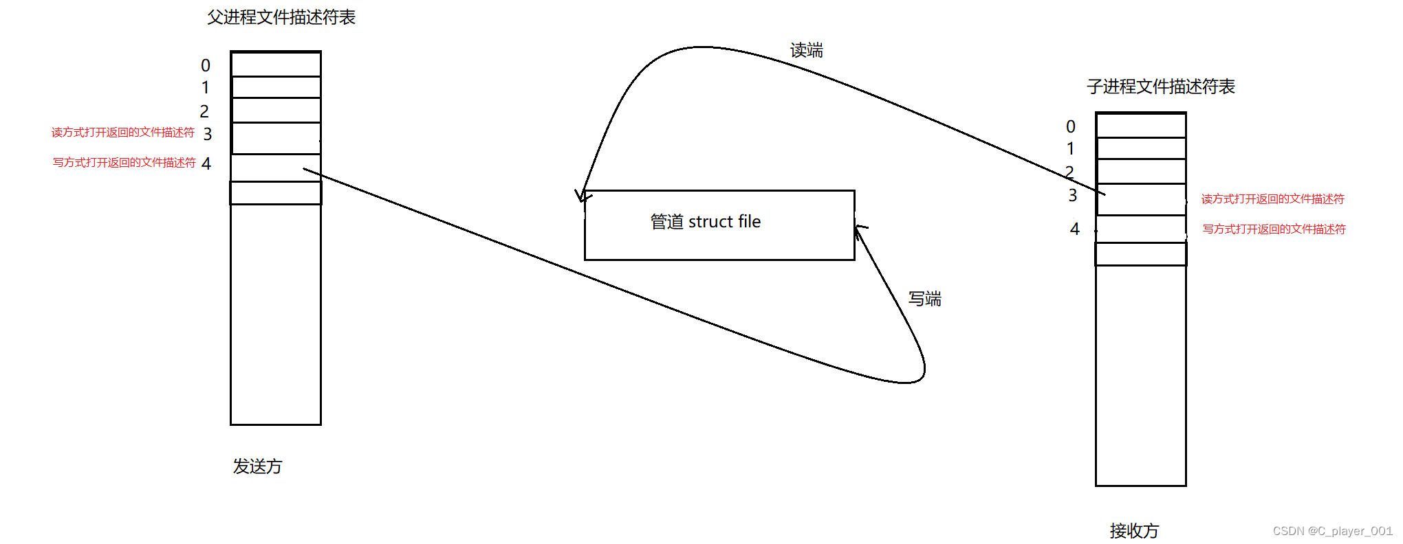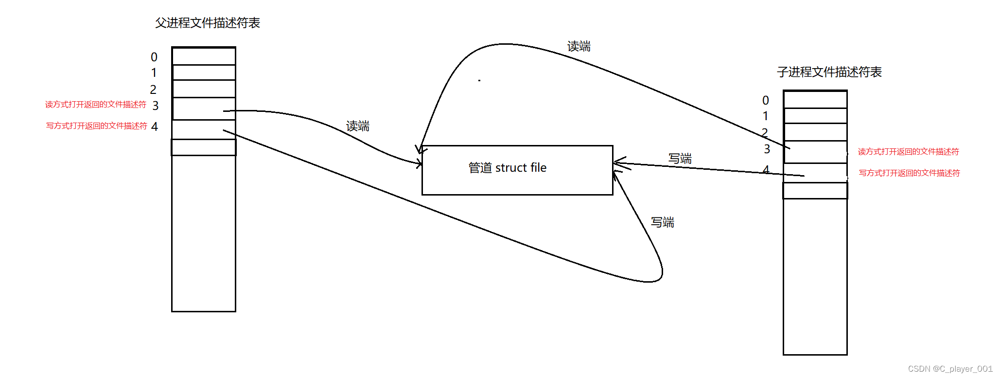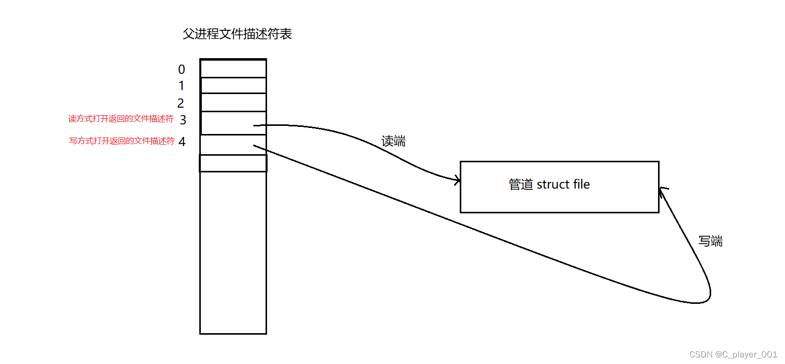 父进程在创建管道式,是分别以读和写方式打开同一个文件的,内存及文件允许这样做,同时父进程会分别得到读方式和写方式打开管道文件返回的的文件描述符。意思就是,我们可以通过一个调用获得两个文件描述符,这里的调用我们马上就能看到,是一个系统调用接口。