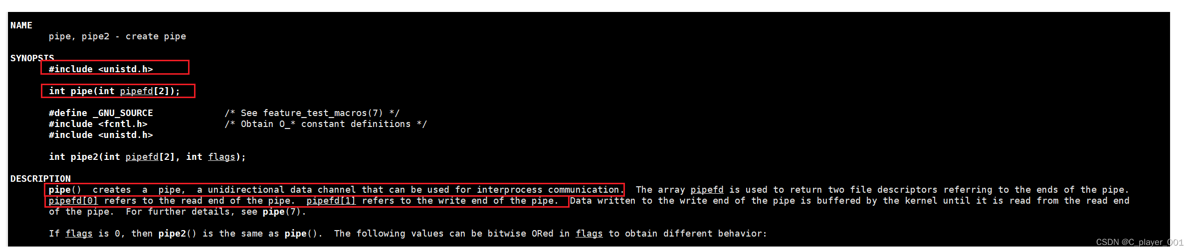 我们可以看到 pipe要传的参数仅仅是一个两个整形的数组,这个数组是用作输出型参数的,也就是用来返回打开管道返回的两个文件描述符的, fd[0] 时读端的文件描述符, fd[1]是写端的文件描述符。
