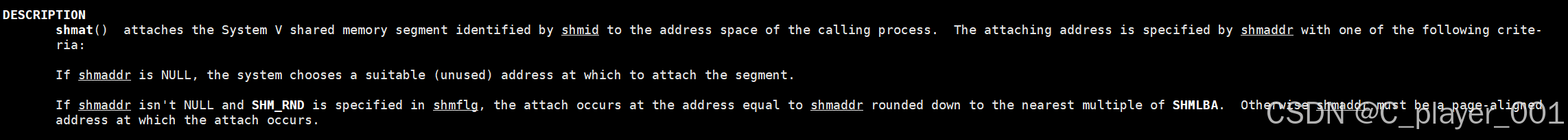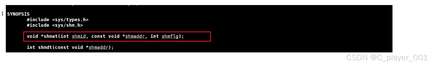 该函数需要传三个参数,返回值是一个void*的地址。shmid参数我们了解,后两个参数是什么呢?