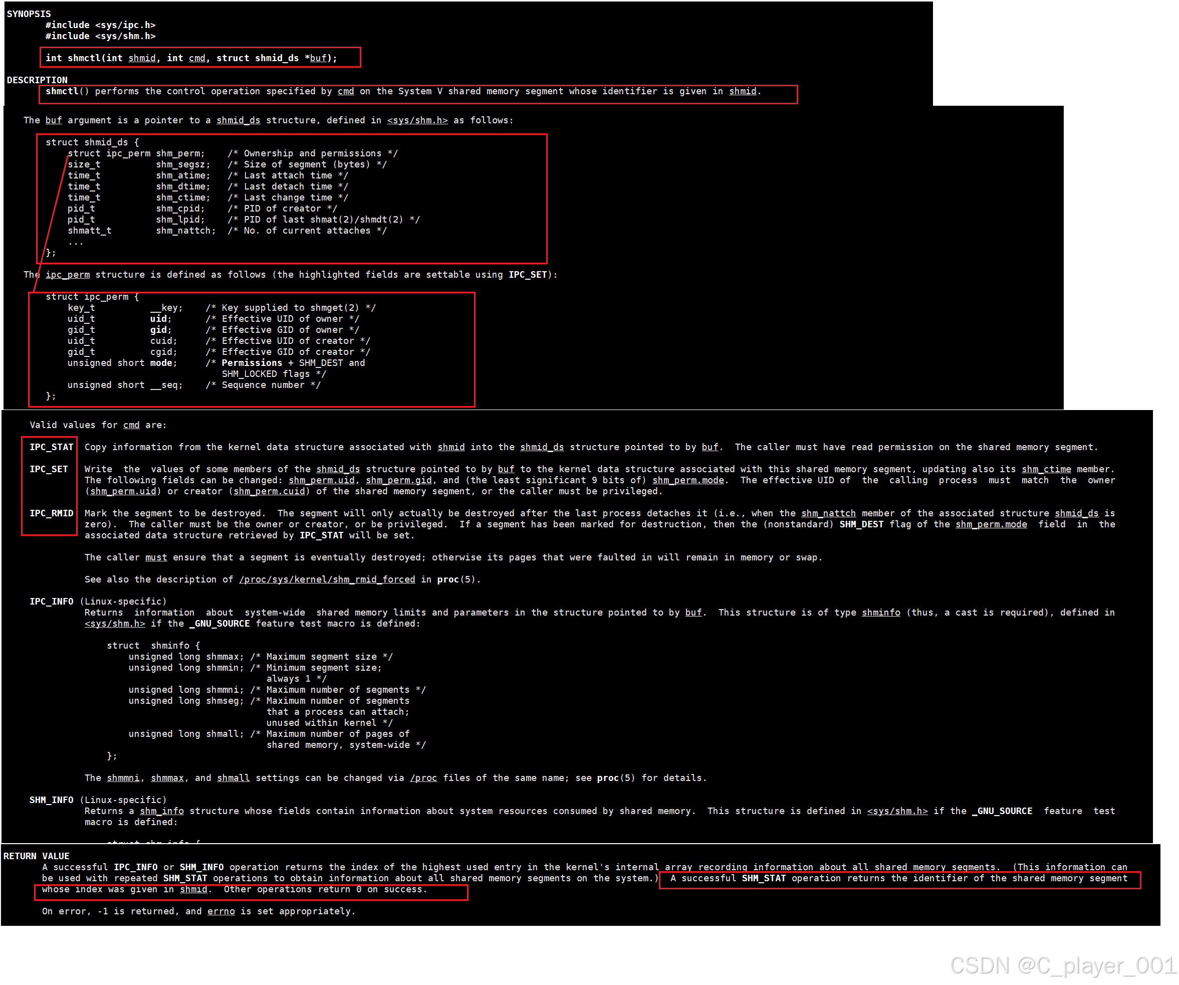 这个接口有三个参数,第一个是就是我们要操作的共享内存的shmid ,而第二个参数 cmd 则是表示你要进行的操作种类,我们常用的就是 IPC_STAT和IPC_SET以及IPC_RMID ,IPC_STAT是用来获取共享内存的属性的,而IPC_SET则是用于设置共享内存的属性,如何获取和设置呢?这就要看我们的第三个参数,他是一个 struct shmid_ds 的结构体对象的指针,如果是要获取共享内存的属性,他么他就会作为输出型参数,将共享内存的属性带回来,而如果是要设置共享内存的属性,那么我们就需要有一个struct shmid_ds 的对象,然后传递他的指针用来设置。这个结构体中的属性我们在接下来再讲。而 IPC_RMID 自然就是用于删除共享内存的,这时候如果我们不需要获取属性等操作,那么第三个参数可以直接传空指针。 函数如果调用成功,如果是获取状态或者设置状态那么就返回进行操作的共享内存的标识符也就是shmid,如果是进行资源释放就返回0,如果调用失败,就返回-1.