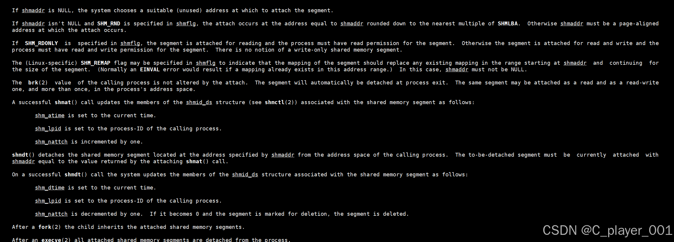 shmaddr这个参数则是我们想要将共享内存映射到那个虚拟地址上,不过我们一般是直接传nullptr,让内核去找一个合适的位置来进行映射,因为我们不是这么了解底层,不清楚具体的地址的布局是什么样的,倒不如直接让内核来找一块合适的空间。