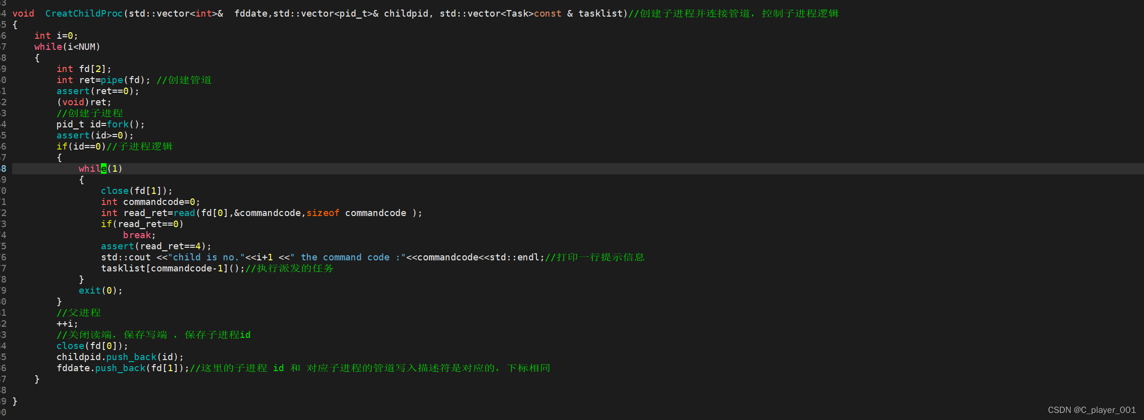 void CreatChildProc(std::vector& fddate,std::vector& childpid, std::vectorconst & tasklist)//创建子进程并连接管道,控制子进程逻辑 { int i=0; while(i=0); if(id==0)//子进程逻辑 { while(1) { close(fd[1]); int commandcode=0; int read_ret=read(fd[0],&commandcode,sizeof commandcode ); if(read_ret==0) break; assert(read_ret==4); std::cout <<"child is no."<