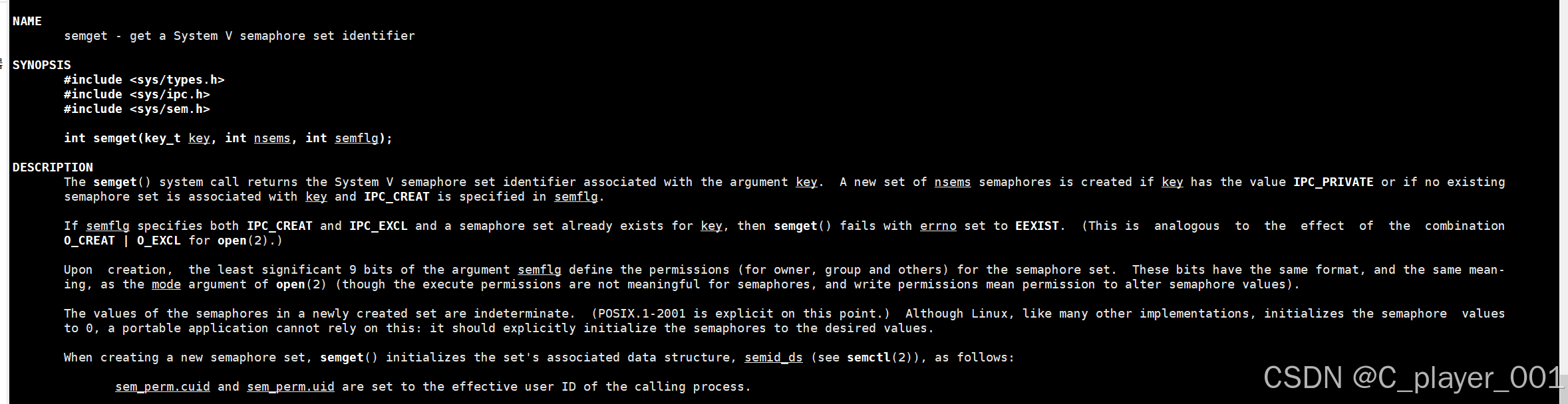 他的参数的key和flag没什么好讲的,第二个参数 nsems 表示要申请的信号量资源的个数。没错,system V 版本的信号量在底层是允许申请多个信号量的,这里的信号量的个数不是指信号量的值,信号量的值就是计数器的数值,而信号量的个数则代表申请的公共资源的个数,每一份公共资源都由一个信号量来控制其中子资源的访问。如果申请成功,semget会返回一个信号量集合的标识符。