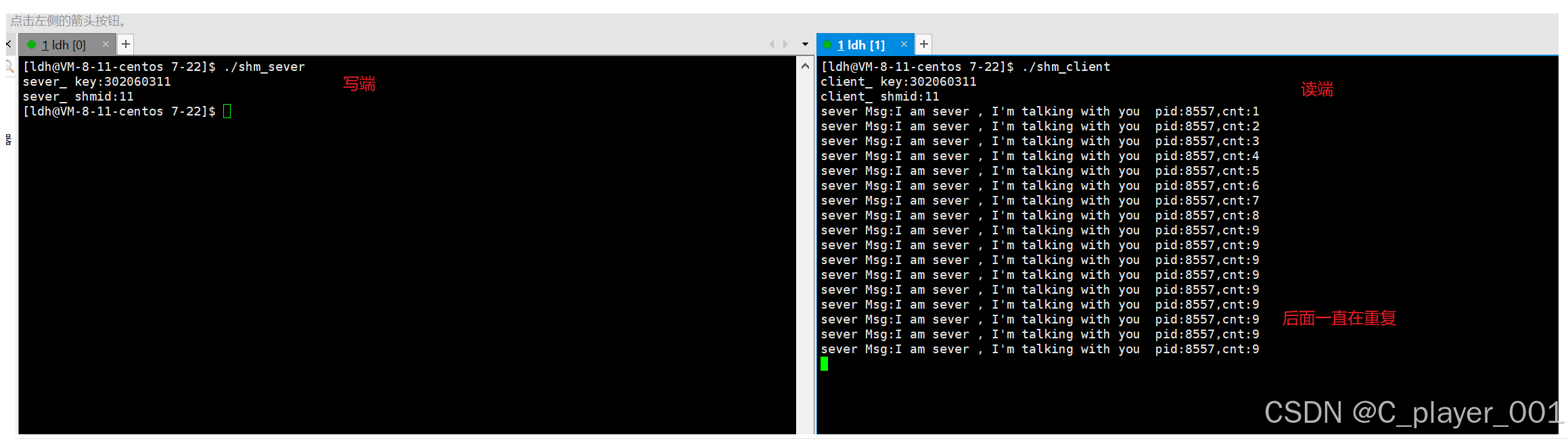 这段代码中,写端每隔一秒写一次,写完十次之后就退出并且释放共享内存,而读端也是隔一秒就读取一次,但是没有设定多少秒之后就停止,我们来看一下结果