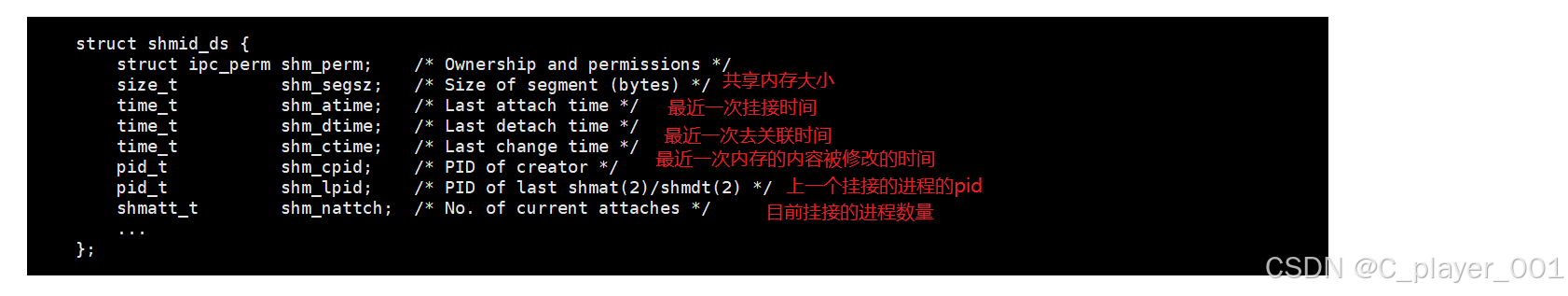 这个结构体对象是操作系统主动暴露给用户的一部分用户级数据,注意这只是操作系统对共享内存进行管理的数据结构的一部分,操作系统不可能将该共享内存的所有的数据结构都给你放开,尤其是用于管理的字段,他给我们放开的只是属性字段,属性字段只是操作系统管理共享内存的数据结构的一个子集。