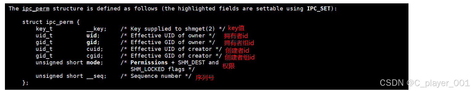 我们能发现,key字段并不是直接存储在 shmid_ds表面的,而是存在它的第一个字段也就是 ipc_perm结构体中。而ipc_perm的第一个字段就是 key ,所以在内存上来看, key 就是整个shmdi_ds的第一个字段。