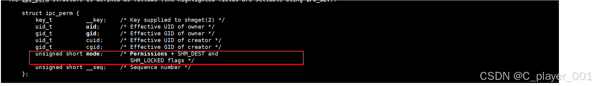 但是当我们去访问这个返回的地址时,却发现报错了,没有权限,这是为什么呢?在挂接的时候明明传了0,默认不就是可读可写的吗?其实不是因为这里的权限设置,而是我们在申请这块共享内存的时候,没有为共享内存设置初始权限,所以默认就是不可读写的,我们可以看一下struct shm_ds中的一个字段,struct ipc_perm