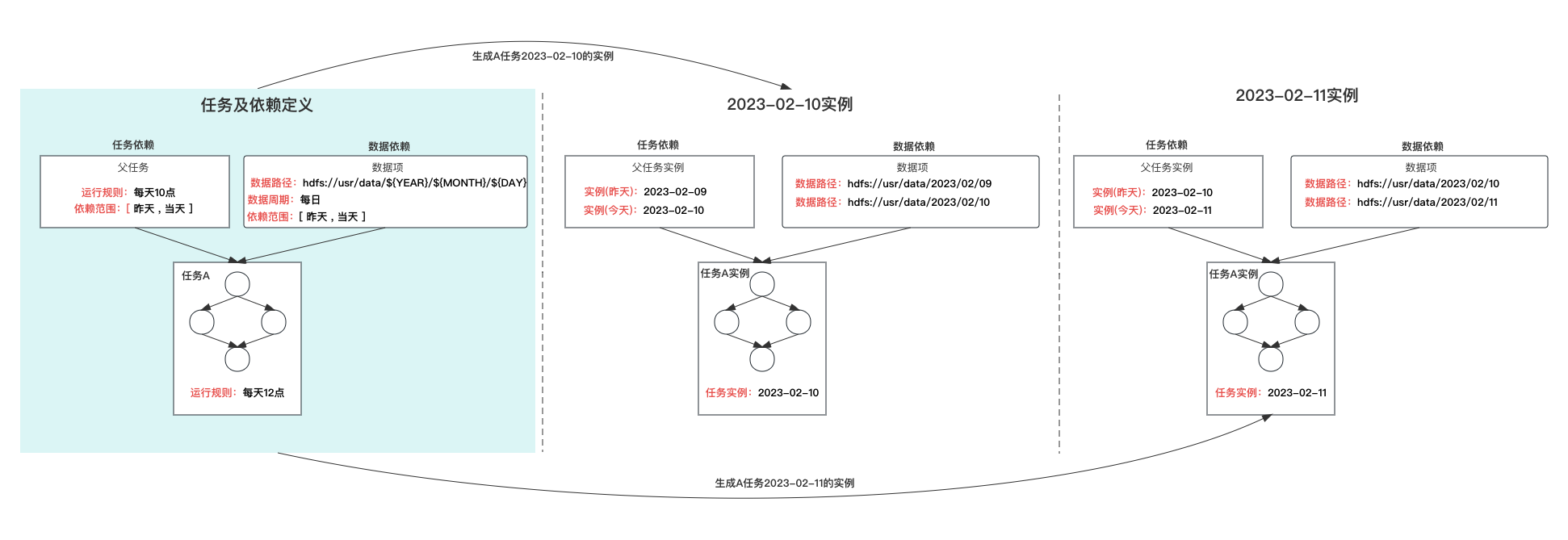 任务定义是任务配置的载体,无状态、不可执行。当任务达到运行周期时,会产生相应周期的任务实例(实例化过程)。实例化时会根据任务的配置信息(环节、上游依赖、数据依赖、运行周期等)生成当前周期实例,实例是真正可执行并具有状态的对象。