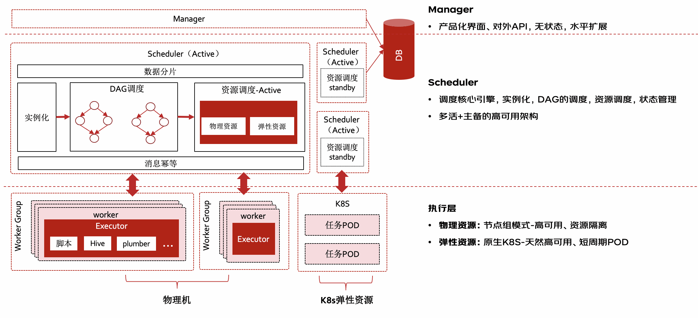 ▪物理机:部署worker(也称TaskNode)长进程,任务以独立进程方式运行,多个worker构成节点组对(虚拟节点)外服务,避免单点故障问题。同时worker本身支持消息重传、cgroup资源隔离等高可用特性。