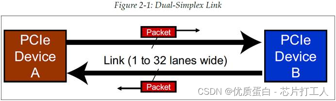 将并行传输转变为串行传输可以极大的减少数据传输需要的引脚数量,也减少了额外的边带信号来指示控制信息。PCIe中定义了传输事务数据包(Packets)的结构,该结构中包含了事务类型等关键信息,接收方可以通过解析数据包来获取传输事务的类型,从而获悉需要执行什么操作。