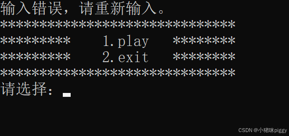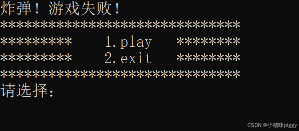 #define _CRT_SECURE_NO_WARNINGS 1; #include "game.h" void game() { char mine[EASY_ROWS][EASY_COLS]; // 存储生成的雷 char show[EASY_ROWS][EASY_COLS]; // 存储排雷后雷的个数 char flag[EASY_ROWS][EASY_COLS]; // 屏幕上,标记的雷 init_mine(mine); // 初始化,全放'0' init_show(show); // 初始化棋盘,全为'*' init_mine(flag); // 初始化全'0','0' 表示未标记,‘1’表示已标记 set_mine(mine); // 随机放雷 find_mine(mine, show, flag);// 扫雷 } int main() { int choose = 0; srand((unsigned int)time(NULL)); // 设置随机种子 do{ print_menu(); // 打印主菜单 scanf("%d", &choose); // 输入选择 system("cls"); // 清屏 switch (choose) { case 1: // 开始游戏 game(); break; case 2: // 退出 break; default: printf("输入错误,请重新输入。\n"); } } while (choose != 2); return 0; }