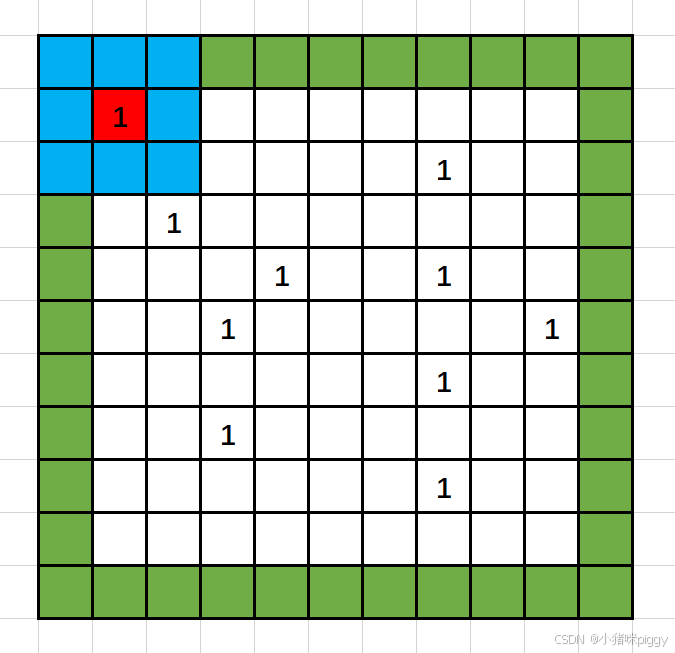 排雷时,如果找到非雷,则显示周围雷的个数。当这个非雷是二维数组的边缘部分时,统计周围雷的个数会发生越界: