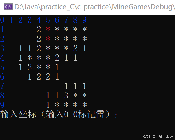 存储棋盘形状的数据,使用二维数组再好不过了,易理解易操作。需要存储的数据:① 哪些位置是雷(用0和1表示)。② 打印在控制台的扫雷画面(未排雷的位置显示 ' * ' ,已排雷且非雷的位置显示周围雷的个数)。