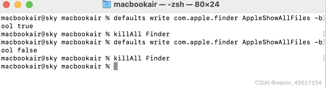 defaults write com.apple.finder AppleShowAllFiles -bool false killAll Finder