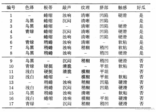 学习开始时,根结点包含样例集D中全部17个样例,权重均为1