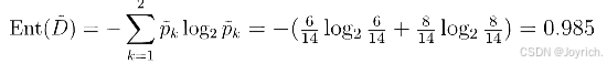 以属性“色泽”为例,该属性上无缺失值的样例子集D包含14个样例,信息嫡为: