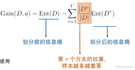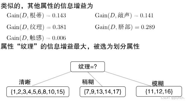 一般而言,信息增益越大,则意味着使用属性α来进行划分所获得的“纯度提升”越大.因此,我们可用信息增益来进行决策树的划分属性选择