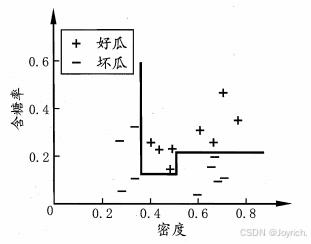 分类边界的每一段都是与坐标轴平行的.这样的分类边界使得学习结果有较好的可解释性,因为每-段划分都直接对应了某个属性取值.但在学习任务的真实分类边界比较复杂时,必须使用很多段划分才能获得较好的近似,