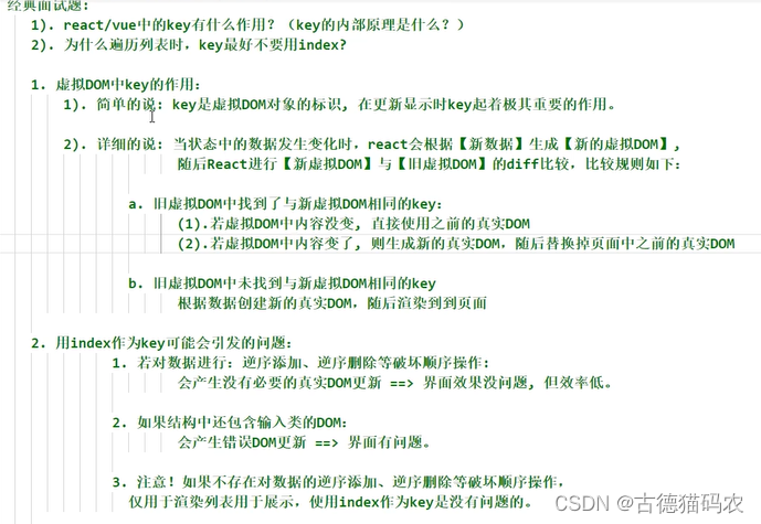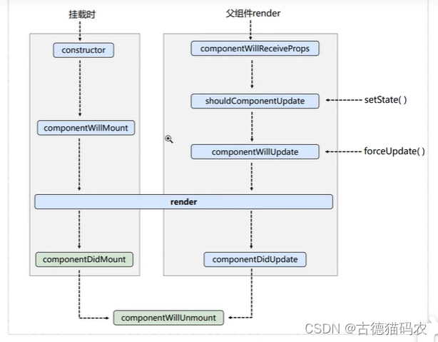 import { Component } from "react"; class Count extends Component { constructor(props) { super(props); this.state = { count: 0, }; this.name = "count"; console.log("count-constructor"); } add = () => { this.setState({ count: this.state.count + 1, }); }; foce = () => { this.forceUpdate(); }; // 组件将要挂载的钩子 componentWillMount() { console.log("componentWillMount"); } // 组件挂载完成的钩子 componentDidMount() { console.log("componentDidMount"); } // 组件将要卸载 componentWillUnmount() { console.log("componentWillUnmount"); } // 组件是否需要更新--阀门 showldComponentUpdate() { console.log("showldComponentUpdate"); return true; } // 组件将要更新 componentWillUpdate() { console.log("componentWillUpdate"); } // 组件更新完成 componentDidUpdate() { console.log("componentDidUpdate"); } render() { return ( ); } } class A extends Component { //这个钩子比较奇特,只有操作更新的时候才会调用,第一次传的时候不调用,此处就是操作+1的时候才调用--将要废弃 componentWillReceiveProps(props) { console.log("componentWillReceiveProps",props); } render() { return ( 我是子组件{this.props.name} {this.props.content}