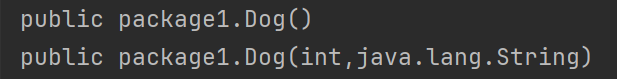 dogClass=Dog.class; Constructor>[] cons = dogClass.getDeclaredConstructors(); for(Constructor> con:cons){ System.out.println(con); } }