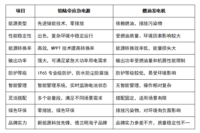 在电网迎峰度夏的严峻挑战面前,铂陆帝应急电源以其卓越的性能和可靠性,成为了不可或缺的电力保障伙伴。与燃油发电机相比,铂陆帝应急电源在多个方面均展现出显著的优势。