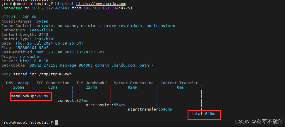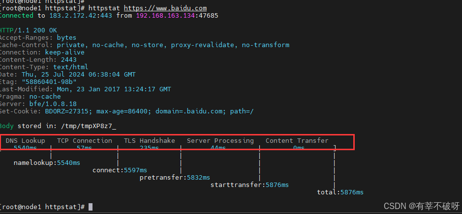 httpstat将向指定URL发送HTTP请求,并显示详细的性能统计信息,如DNS解析时间、连接建立时间、TLS/SSL握手时间、首字节时间、总时间等。