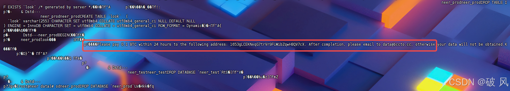 大概的意思就是说,需要在24小时内转0.1个BTC到那个地址才能拿到数据,我们就算重来也不会惯着这种无底线的人,一般没有网络安全或运维的都是小公司,小公司很艰难的,遇到这种无疑是雪上加霜。