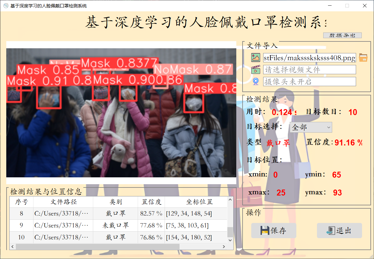 本项目基于yolov8对图像进行训练,可以检测戴口罩的人与没有带口罩的人的图片和视频,除此之外,还提供了数据分析界面,支持检测过的信息转化为excel,信息可视化等功能
