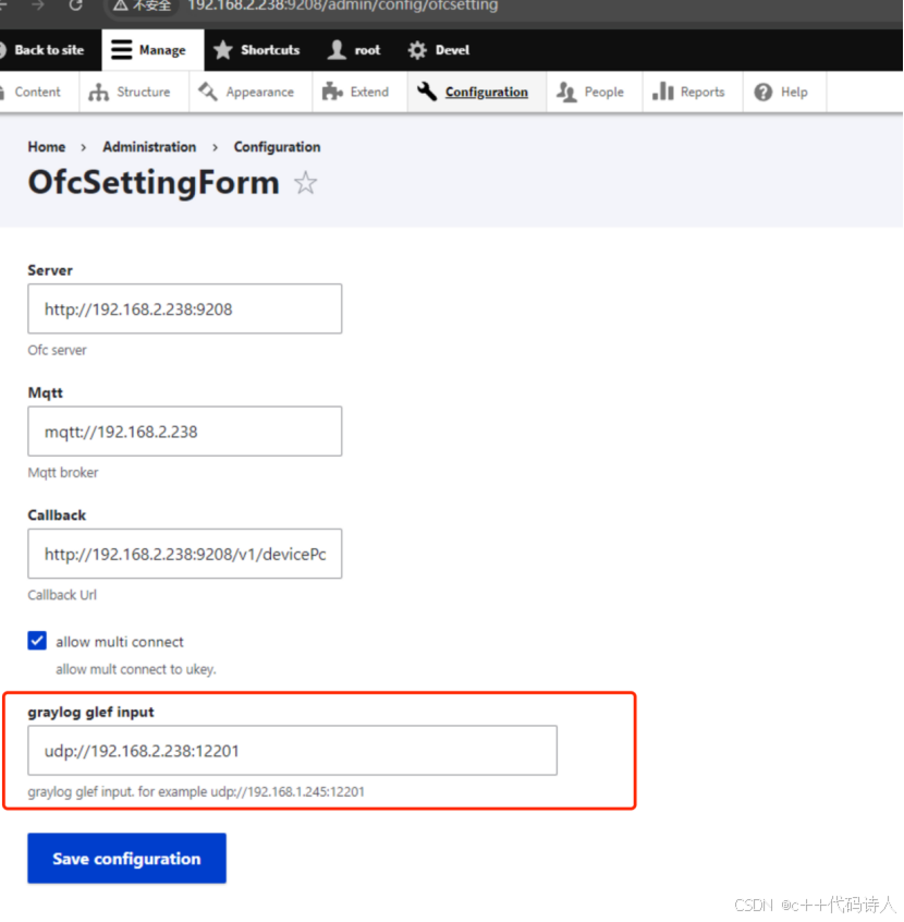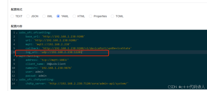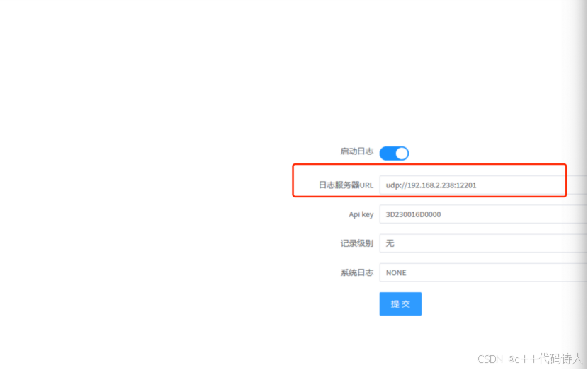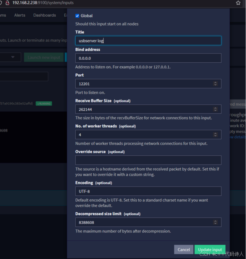 其中192.168.2.238修改为服务器ip, 12201 是端口