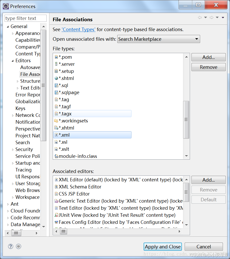 选中*.xml,然后在Associated editors 选中想用的编辑器,设置为default,
