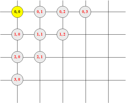 ● 题目中 1<= n <=100,且只能往右或往下走,故必有 1<= m <=100。依据上面分析,在代码中,可设 x 坐标增量 dx 及 y 坐标增量 dy 分别为:dx[]={0,0,0,1,1,1,2,2,3} 及 dy[]={1,2,3,0,1,2,0,1,0}