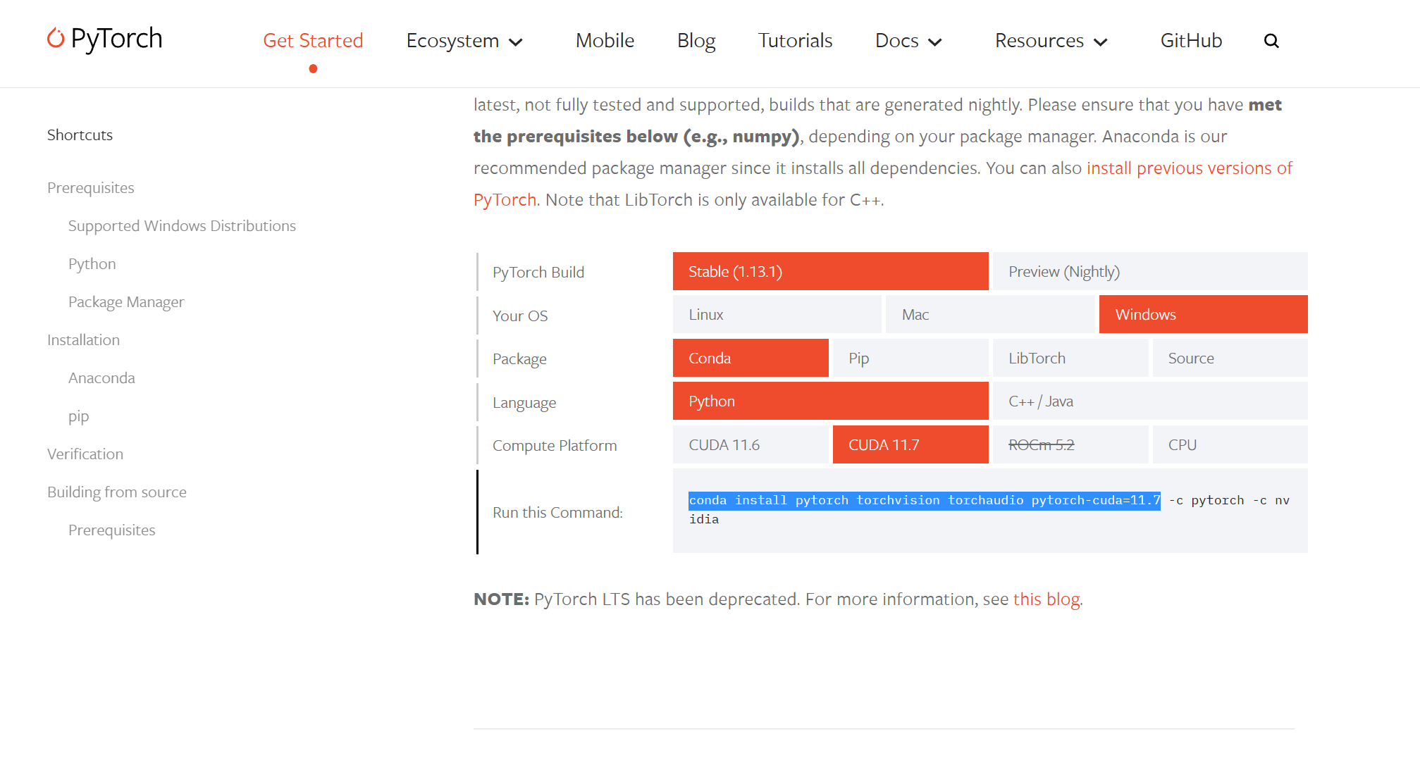 这时我们再打开pytorch的官网(PyTorch),选择我们的版本
