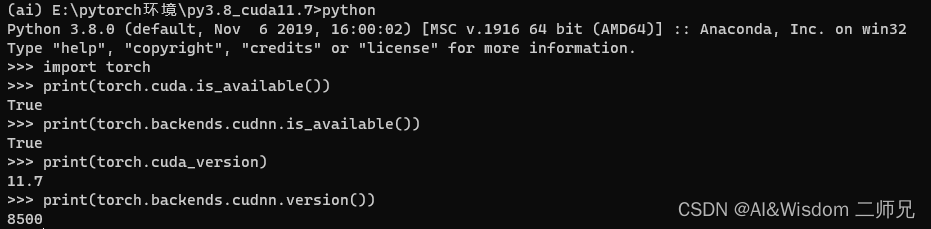 import torch print(torch.cuda.is_available()) print(torch.backends.cudnn.is_available()) print(torch.cuda_version) print(torch.backends.cudnn.version())
