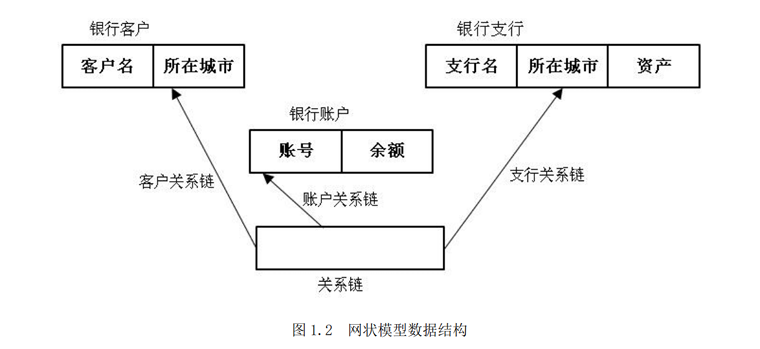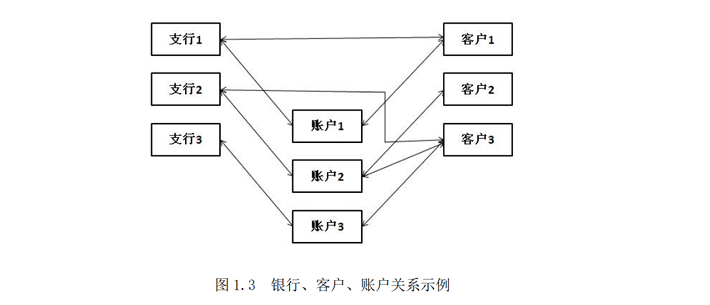 在网状模型中,数据记录组织成图的形式,使用“数据结构图”进行抽象的分析和表示。图 1.2所示的网状模型数据结构图表示的是银行客户、银行账户和银行支行三方面的一种复杂关系。