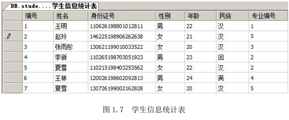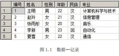 如图 1.1中存储的一行数据,在数据库中称为一条“记录”(Record)。每条记录中的每一个输入项称为“列”。图 1.1中编号、姓名、性别、年龄、民族、专业都是列名。