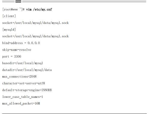 MySQL 通过源码编译方式安装,从5.7.18版本开始在安装包内不提供默认的配置文件my-default.cnf,需要手动创建 MySQL.,配置文件/etc/my.cnf。MySQL,的配置参数非常丰富,可以根据不同的需求进行调整。这里只给出基本配置,具体内容如下。