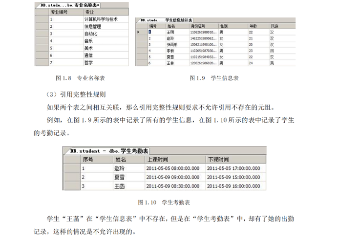 域完整性也称列完整性,指定一个数据集对某一个列是否有效或确定是否允许空值例如,在图1.9所示的“学生信息表”中,定义“性别”字段只能取值为“男”或,这样该列就不会输入其他一些无效的值,如“female”、“苗族”等。“22”