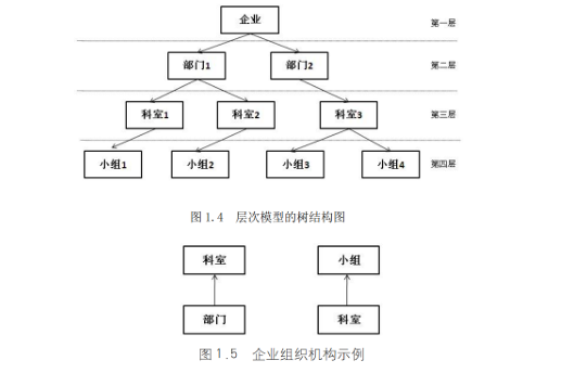 图1.4所示的层次模型的树结构图抽象于图1.5所示的实际情况,它包含了下列关系企业下辖多个部门(一对多)。产部门下辖多个科室(一对多)。