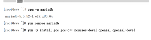 卸载 MariaDB、编译工具 cmake 的安装以及 boost 支持包的准备。(1)如果 Cent0s 7.3 已安装mariadb 数据库,必须先将其卸载,然后再开始进行源码安装。