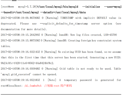 为了能够正常使用MySQL 数据库系统,应以mysql 用户的身份执行初始化,指定数据存放目录等。注意:最后一行会生成一个随机的临时密码,请牢记!