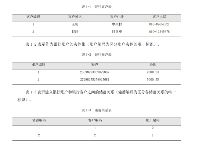 表 1-1表示作为银行客户的实体集,客户编码为区分客户实体的唯一标识。