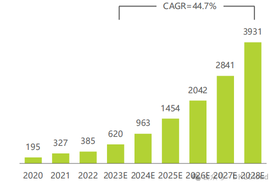 2023年,中国AI芯片市场规模约为620亿元。近年来,国央企加大算力基础设施建设,由更多人工智能产业服务商作为生态伙伴参与共建,强化需求牵引与行业赋能,2028年中国AI芯片市场规模将达到3931亿元,五年复合增长率达到44.7%。