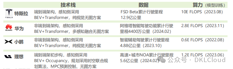 从技术来看,特斯拉率先完成端到端落地,领先国内厂商1-2个身位,其背后是提前多年的前瞻性技术实践。当自动驾驶与Transformer融合越紧密,其所表现出的数据和算力驱动特征会愈发明显。来自真实驾驶环境的数据是模型训练最重要的数据来源之一,从数据与算力储备看,国内头部车企与特斯拉仍存在较大差距。