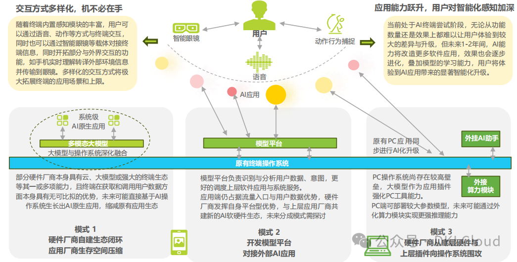 从用户感知视角,多模态的人机交互将解放用户双手,AI终端将从存储—应用—交互一体的娱乐/工具机,逐渐演化为用户随身携带的智能BOX。作为智能算力和应用的载体,终端应用的范围和能力也将得到极大拓展。从技术栈层面,操作系统作为全机能力调度的核心将发挥更显著的主体性作用,硬件厂商将以AI操作系统为核心重塑自身生态,原有软件厂商的用户数据与流量入口优势或将被削弱。