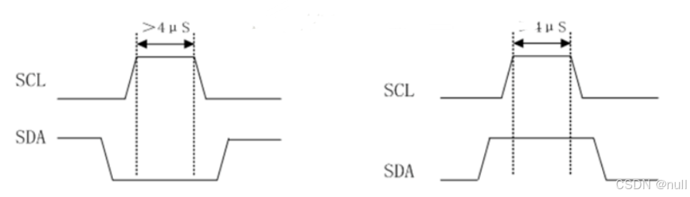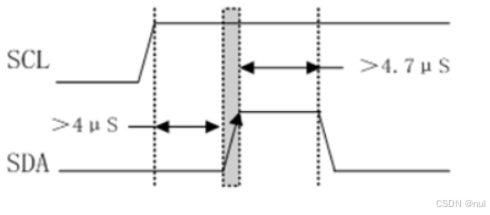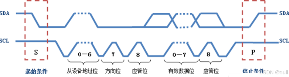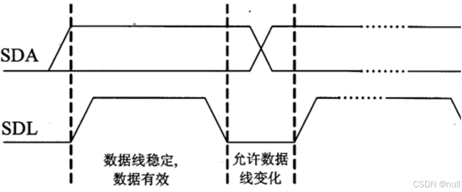 即:SDA线上的数据在SCL时钟“高”期间必须是稳定的,只有当SCL线上的时钟信号为低时,数据线上的“高”或“低”状态才可以改变。