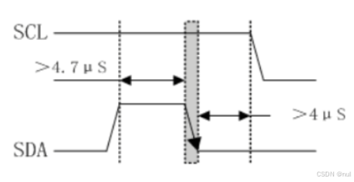 开始信号:在SCL 串行时钟线为高电平期间,SDA 线由高电平向低电平的变化表示起始信号,只有在起始信号以后,其他命令才有效。