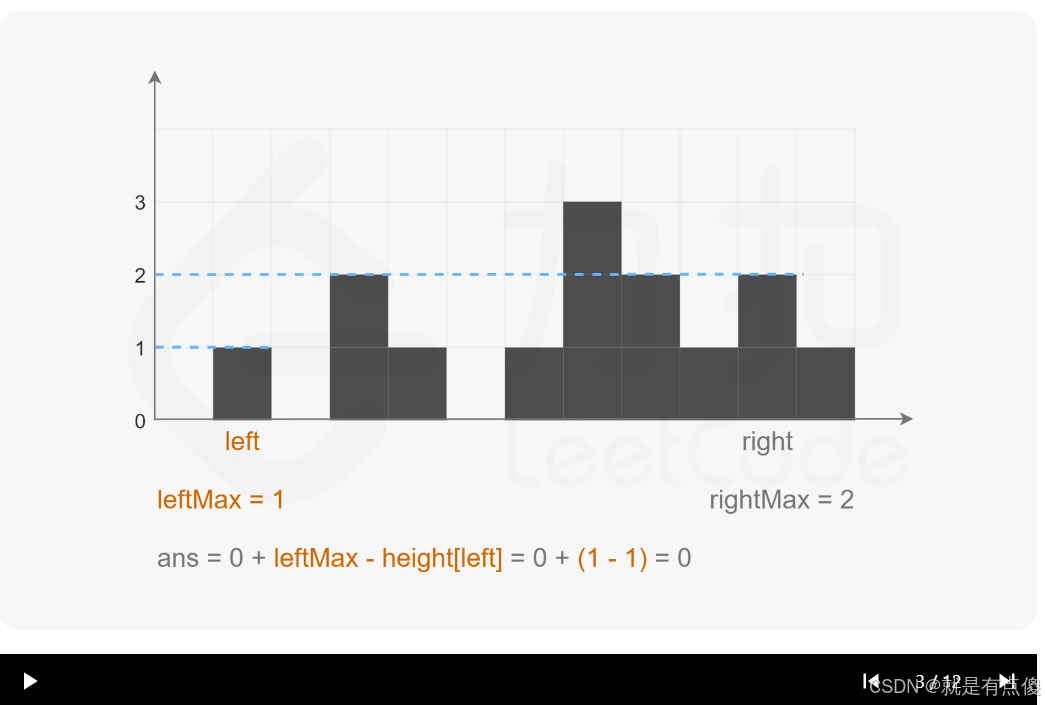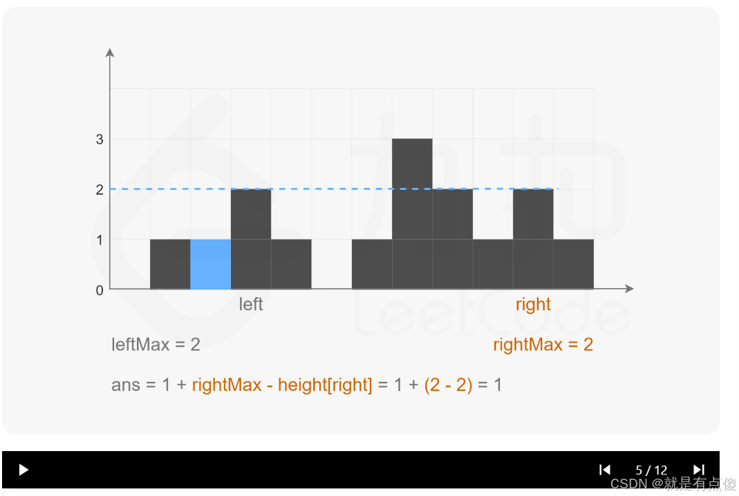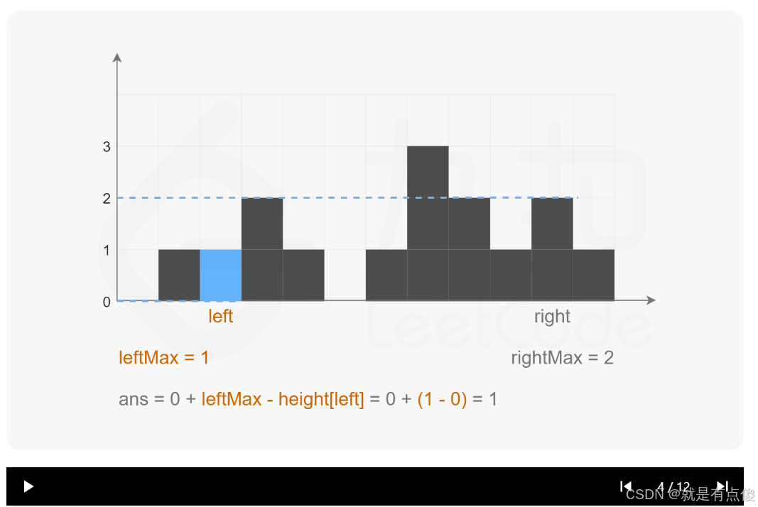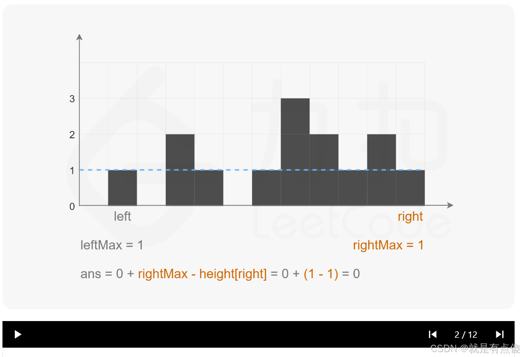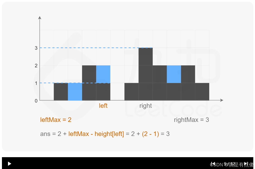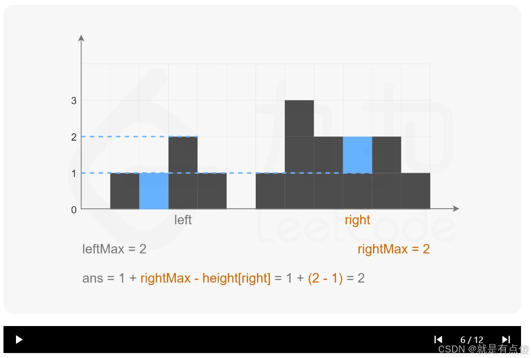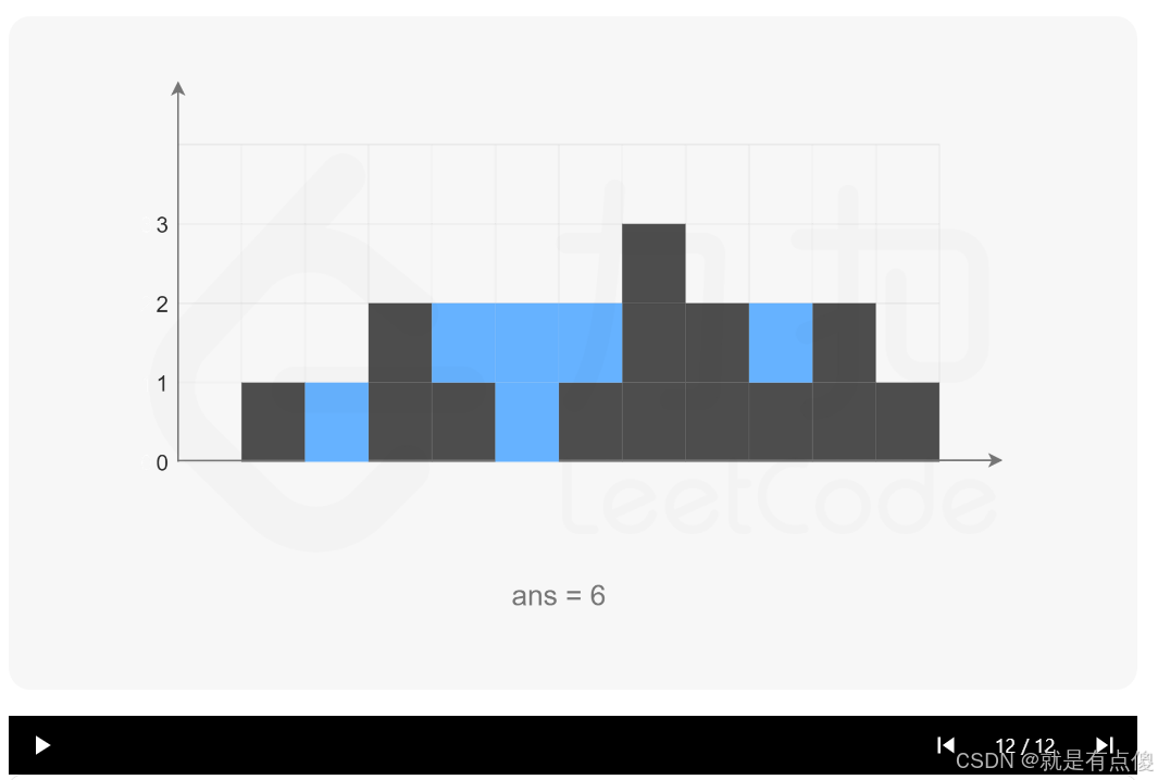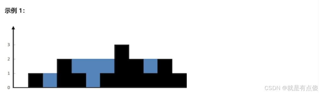 输入:height = [0,1,0,2,1,0,1,3,2,1,2,1] 输出:6 解释:上面是由数组 [0,1,0,2,1,0,1,3,2,1,2,1] 表示的高度图,在这种情况下,可以接 6 个单位的雨水(蓝色部分表示雨水)。