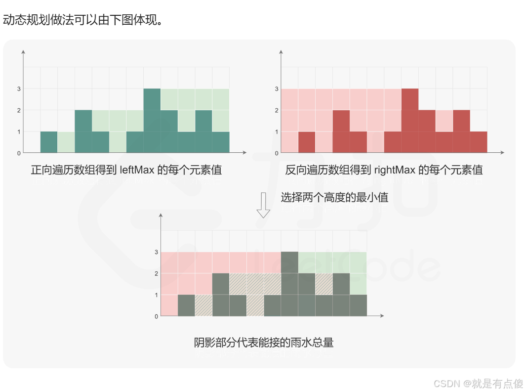 上述做法的时间复杂度较高是因为需要对每个下标位置都向两边扫描。如果已经知道每个位置两边的最大高度,则可以在 O(n) 的时间内得到能接的雨水总量。使用动态规划的方法,可以在 O(n) 的时间内预处理得到每个位置两边的最大高度。
